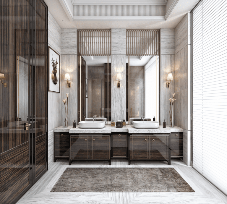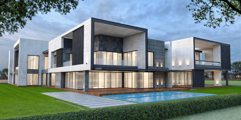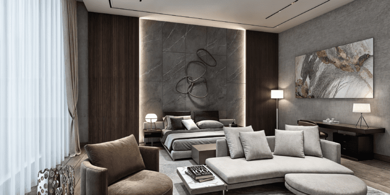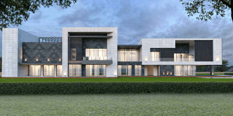 The selection of materials includes a rich palette of natural materials, creating a warm atmosphere, while the exterior harmonises textured stone with sleek finishes, seamlessly integrating into the environment. Inside, polished marble, warm wood veneers, and soft fabrics enhance the sensory experience, rich wood panelling in intimate areas fosters warmth, and expansive glass and steel elements in living areas invite abundant natural light.