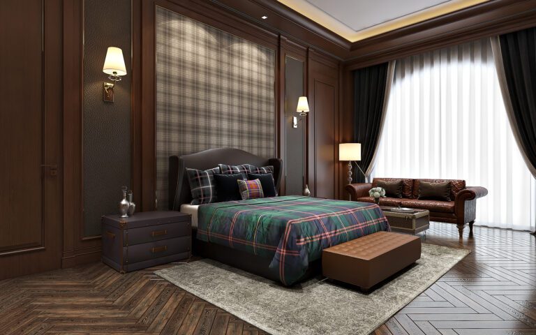 The design approach extends to the bedrooms, where the interplay of contrasting tones creates a serene, restful atmosphere. In the first bedroom, the soft combination of warm beige and walnut brown invites comfort and respite, while the minimalistic design allows the room to remain uncluttered and peaceful. The master bedroom, with its plaid motifs, strikes a balance between visual contrast and unity. The dark wood panels in the room complement the soft green bedding, creating a perfect harmony of textures and tones that elevates the space.