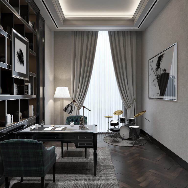 The design of the cosy home office, evokes nostalgia with its colonial-era workstation juxtaposed against muted linen drapery. The space is anchored by a floor-to-ceiling bookcase, while botanical motifs on the backdrop subtly enhance the room’s charm. This home office feels like a journey into the workspaces of yesteryear—elegant, refined, and timeless.