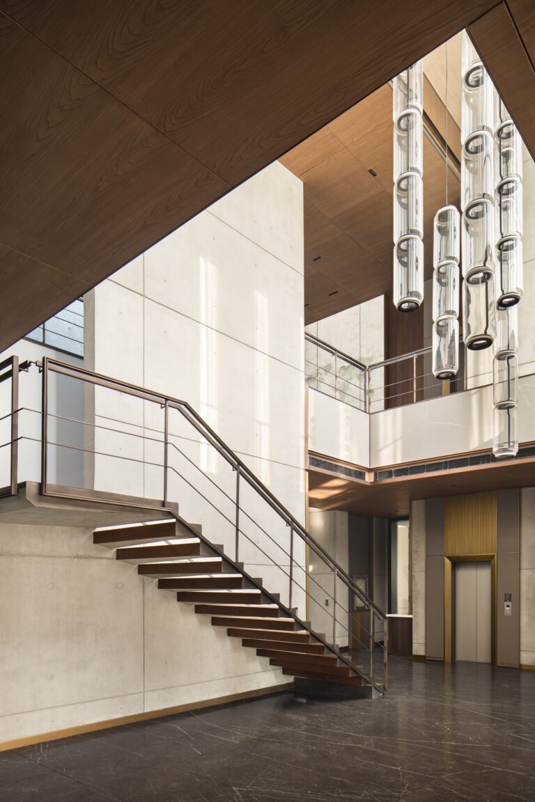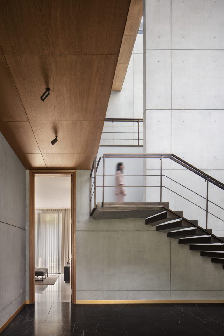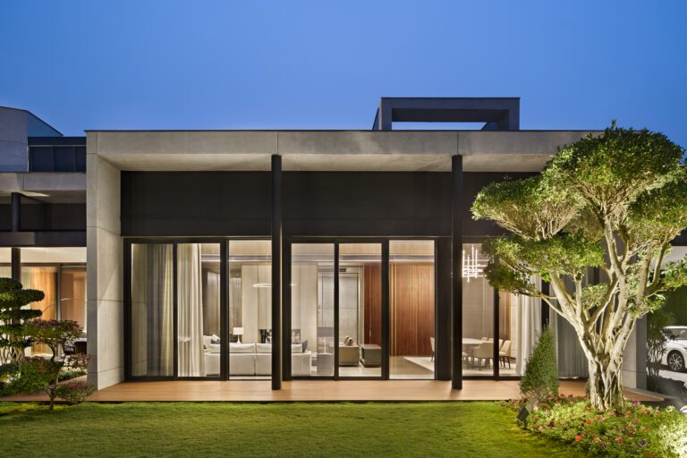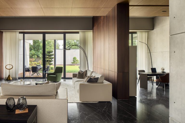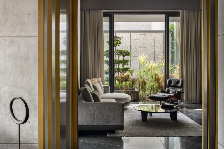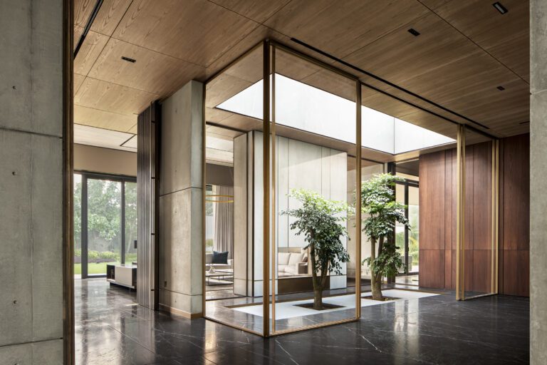 A plush foyer sets the tone for the home’s understated elegance as one enters through a detailed brass door. A central courtyard serves as the heart of the villa, connecting common areas and private spaces with large glass panels that flood the interior with natural light.