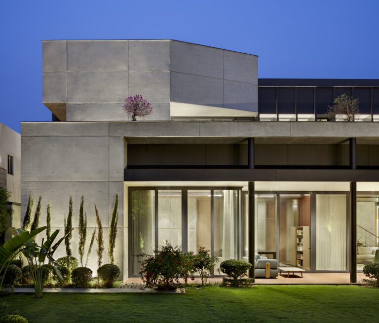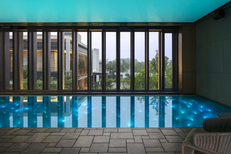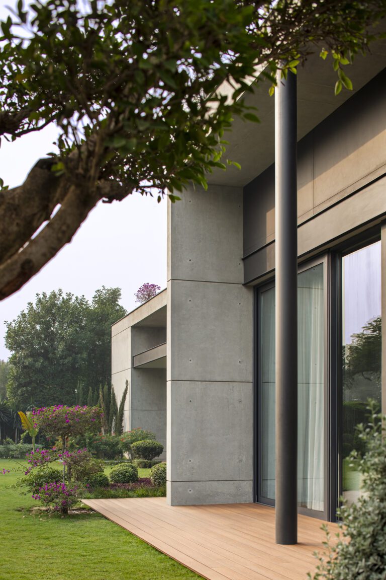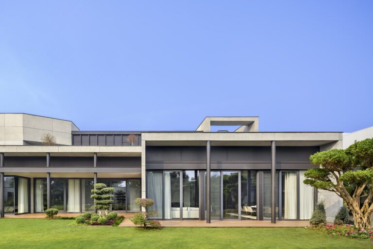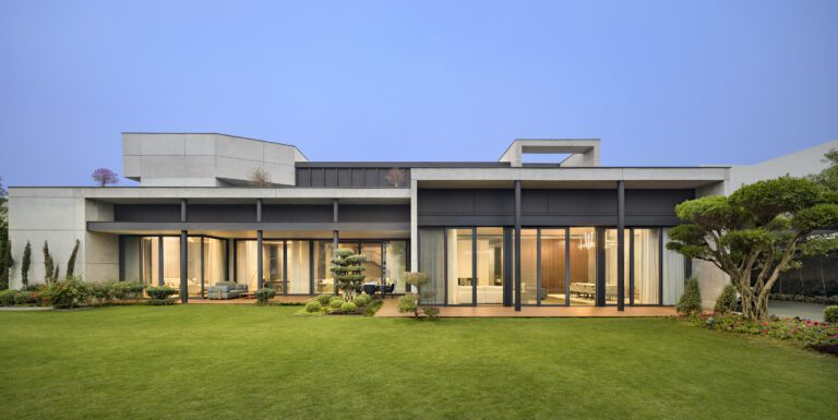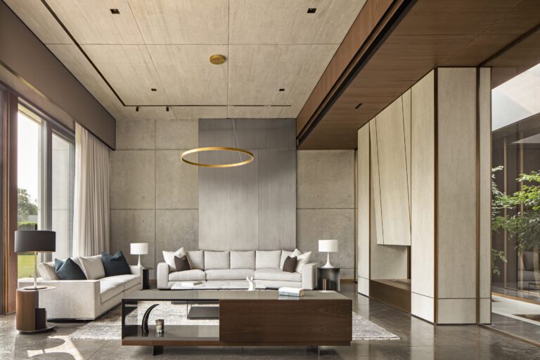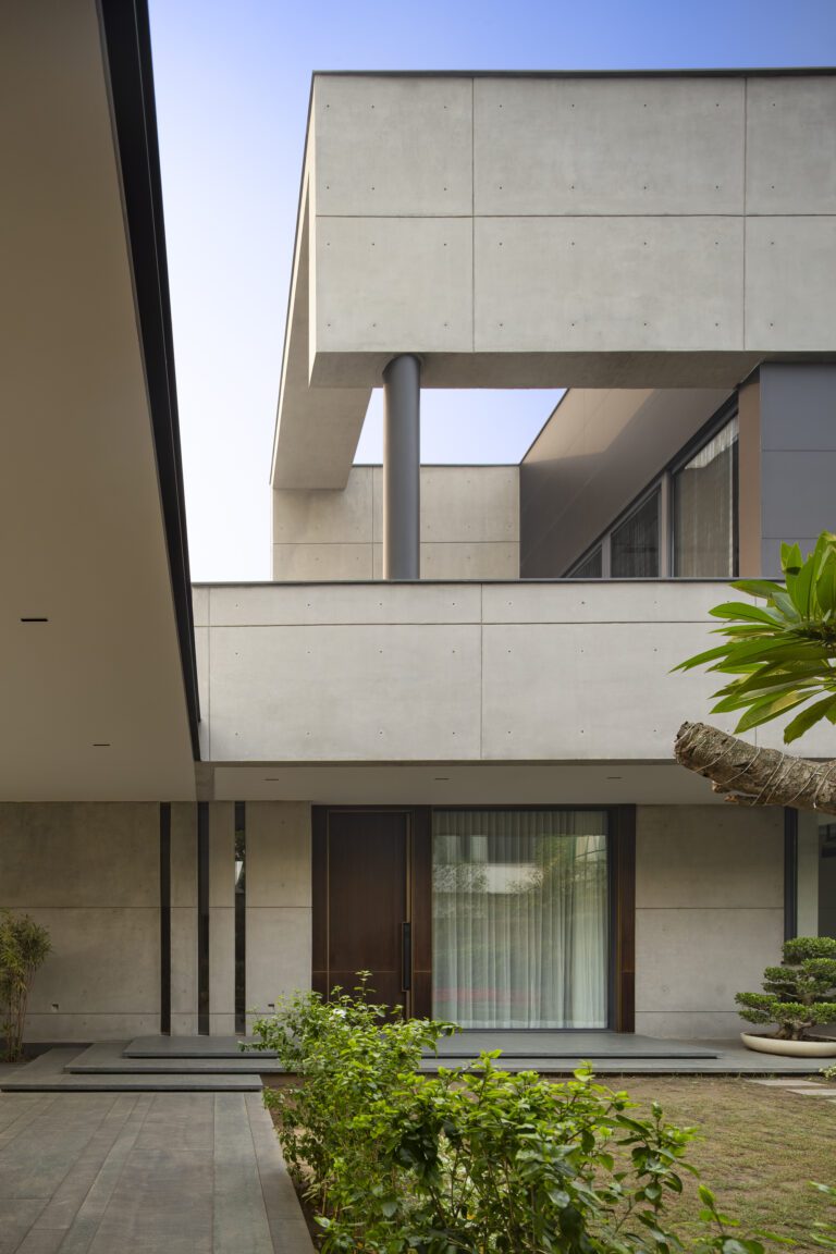 The Courtyard House redefines modern luxury by celebrating the raw beauty of structural materials. The villa’s clean lines and geometric forms, combined with muted concrete hues, create a striking contrast with the surrounding lush greenery. The interiors are rooted in a minimalist design narrative, amalgamating hints of industrial decor and channelling a laid-back vibe.