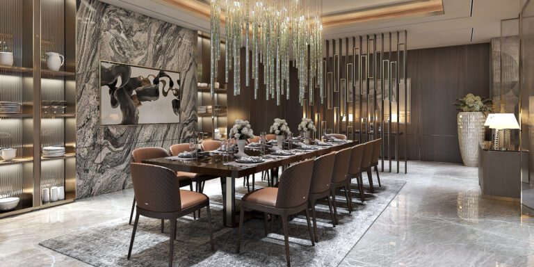 At the heart of this residence, a sophisticated layering of textures creates a spatial experience that engages both the eyes and the mind. The intricate patterns on the walls elevate the ambience of each room, transforming them into a dynamic art gallery. Rather than merely serving as a backdrop, the walls themselves become the canvas, telling a story that balances beauty and function.