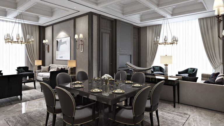 This commercial space redefines luxury through an interplay of grandeur and intimacy, drawing inspiration from the timeless elegance of the Art Deco era. Coffered ceilings, dark-toned wood furniture with gilded accents, and geometric marble flooring reflect an opulent character, while subtle infusions of green and blue tones soften the formality, crafting spaces that are both striking and inviting.