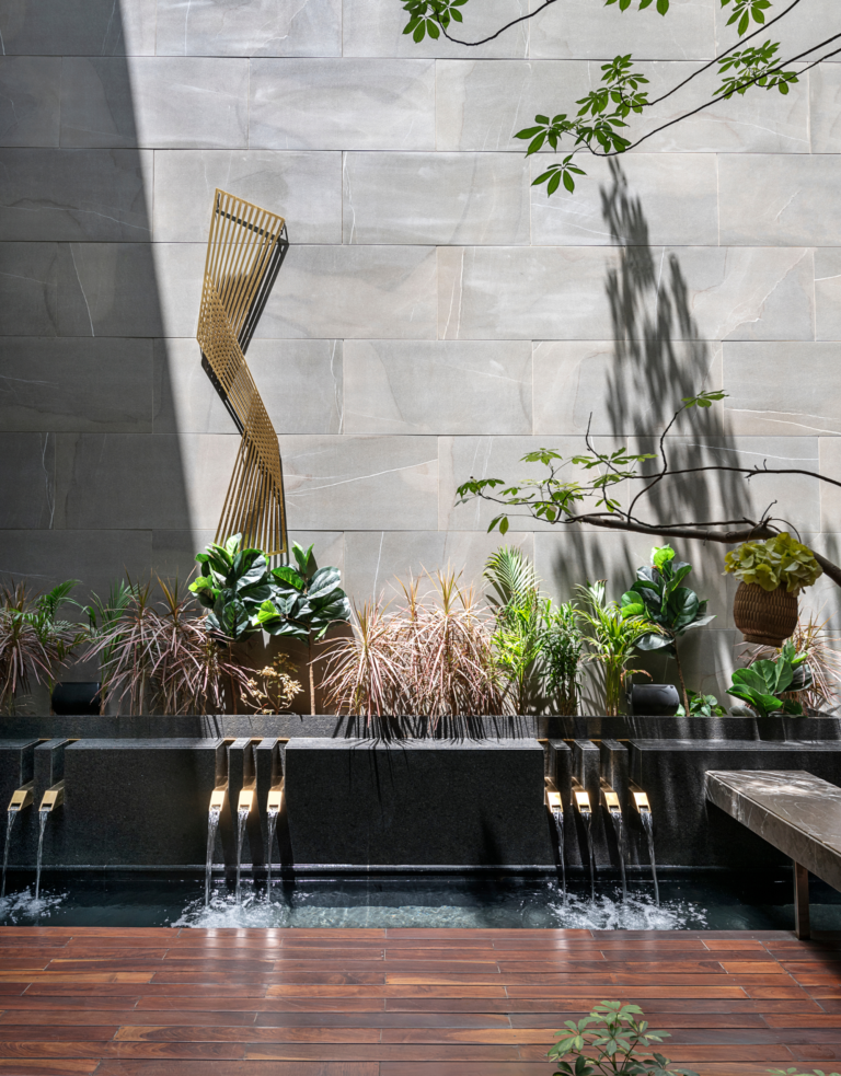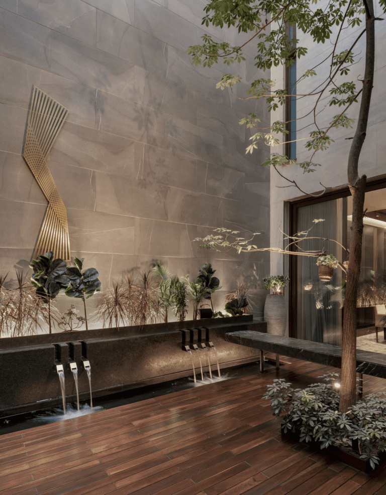 With clean-lined planters brimming with ferns and trees, the space’s palette complements the neutral hues of the textured walls and the subtle sophistication of the wood-panel accents. The seamless integration of a built-in fireplace and seating area transforms this space into a cozy yet elegant zone, ideal for intimate gatherings or peaceful solitude.