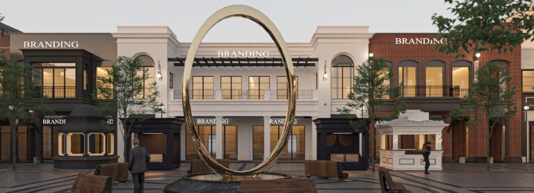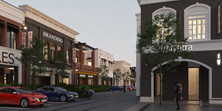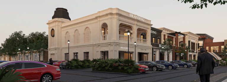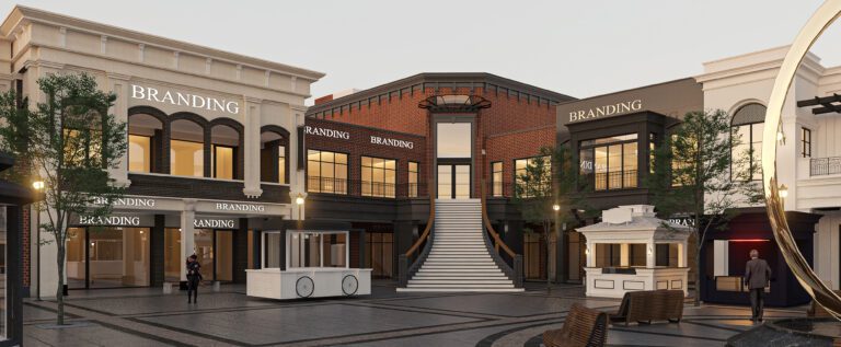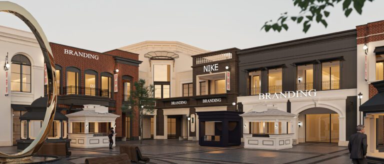 The High Street retail project effortlessly merges neoclassical elegance with modern sophistication. Symmetrical facades, classical columns, and clean lines incorporate contemporary elements like expansive windows and sleek signage. The result is a design that pays homage to European architectural heritage while embracing a global, modern sensibility.