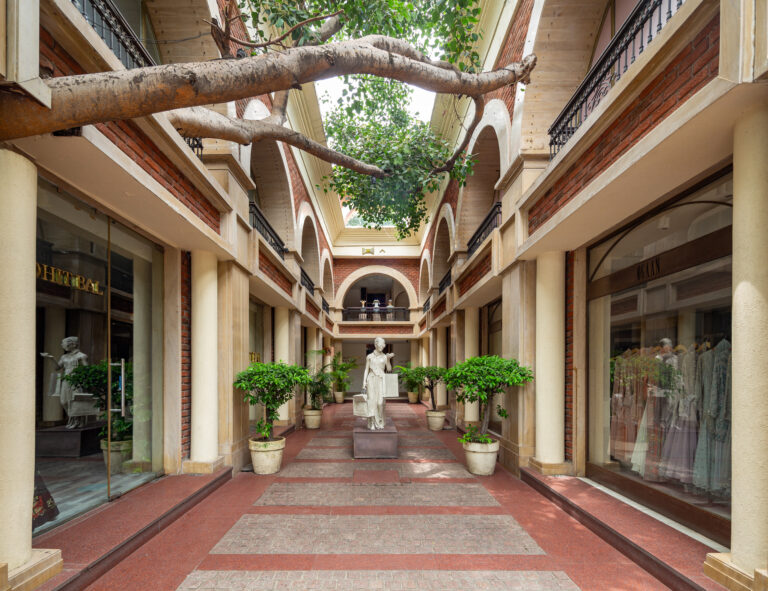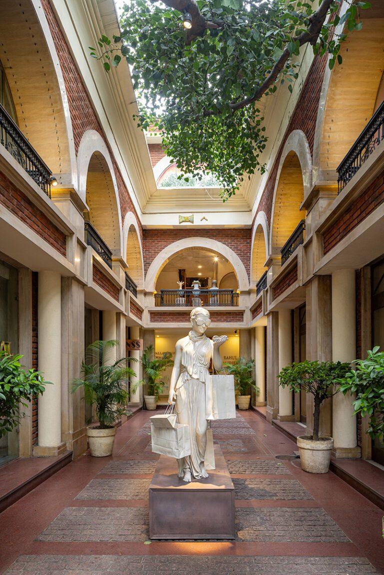 The tree’s branches breathe life into the contemporary design, blending the warmth of exposed brick with the luxury of modern retail aesthetics. This project’s material palette blends Delhi’s rich architectural heritage with modern aesthetics, and the space itself fosters longer, more meaningful visits, benefiting retailers by ensuring a leisurely, comfortable shopping experience and offering a moment of pause for visitors.
