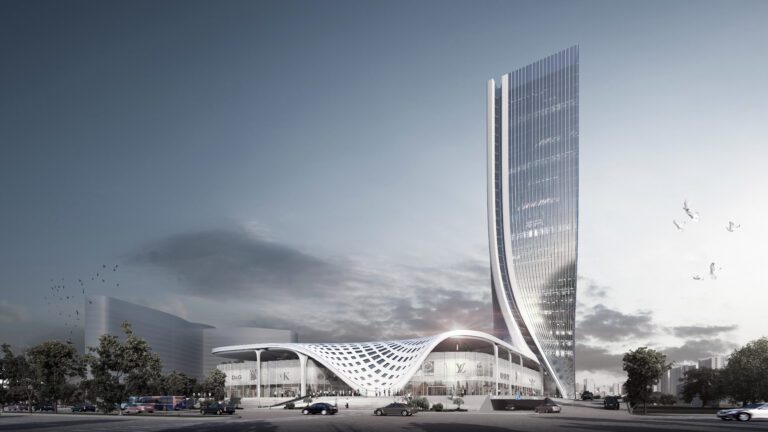 A helical twist runs through the tower, with each rhomboid-shaped floor plate aligned to shift the tower around its vertical axis gently. The twist reduces as the levels ascend so that no two stories are completely aligned. This curvilinear form tends to represent the centripetal forces of the three axes of the city converging at its base, creating a vortex of living. The neutral facade scheme induces lightness to an elongated building and creates a vibrant dialogue with the surroundings. Inclined white columns running up either side of the twist provide a visual link to the white podium below that extends to the rear of the tower and holds a retail complex.