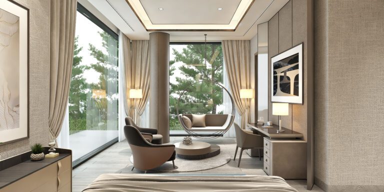 Inside, the residence is curated to reflect the intellect and personality of each space, where luxurious materials and meticulous detailing converge into an environment of understated elegance. The master suite and guest rooms are intentionally composed with a neutral palette accented by rich textures, while the second-floor party bar serves as a dynamic social hub—a contrast to the residence’s serene interiors, embodying versatility in design.