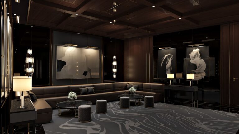 This clubhouse redefines modern recreation spaces by intertwining light, texture, and geometry to create a visual symphony. It occupies the intersection of luxury, relaxation, and entertainment, where every design choice is a deliberate nod to sophistication. A monochromatic palette of charcoal, beige, and earthy tones binds the space, evoking balance, depth, and elegance across multifunctional settings.