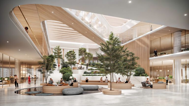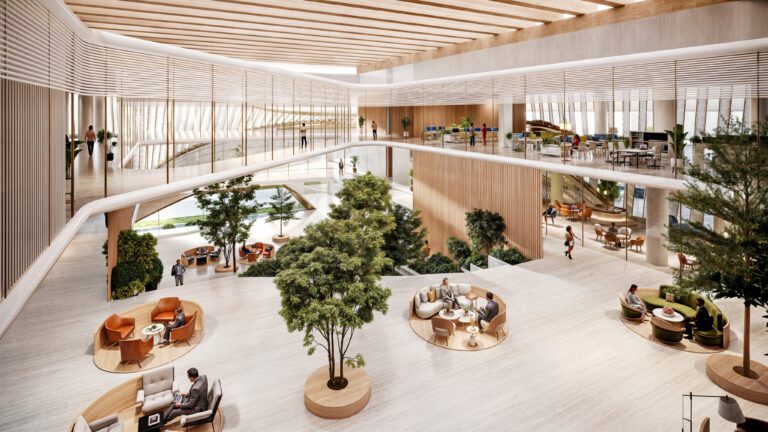 At the heart of the centre is a terraced atrium, where a sanctuary of greenery and water features is designed to nurture both scientific discovery and employee well-being. This central space encourages collaboration while offering moments of reflection, bringing together the mind and spirit in a harmonious environment.
