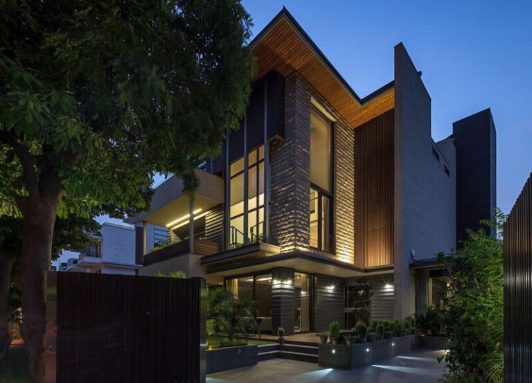 This contemporary residence epitomises modern luxury with its seamless fusion of bold architectural lines and refined interiors. The façade, characterised by clean geometries and natural materials, establishes a striking yet harmonious presence within the surrounding greenery.