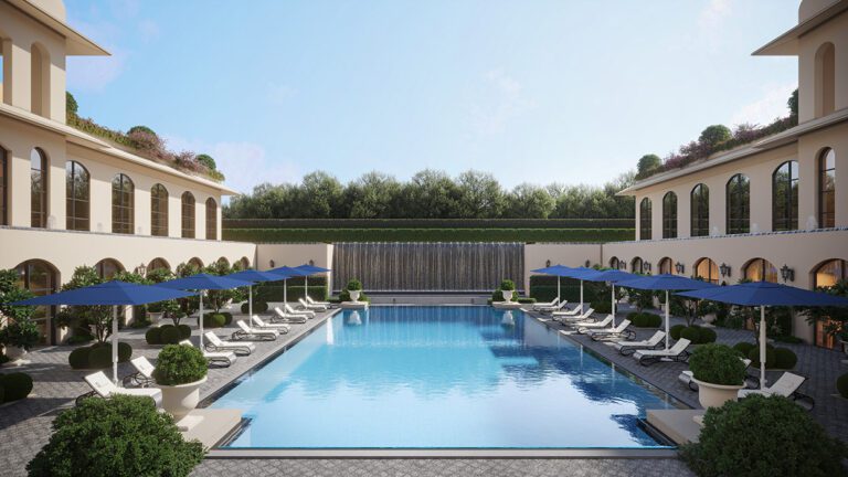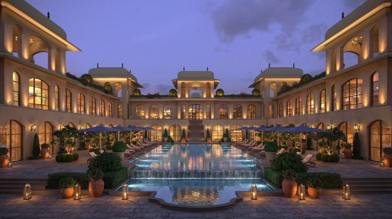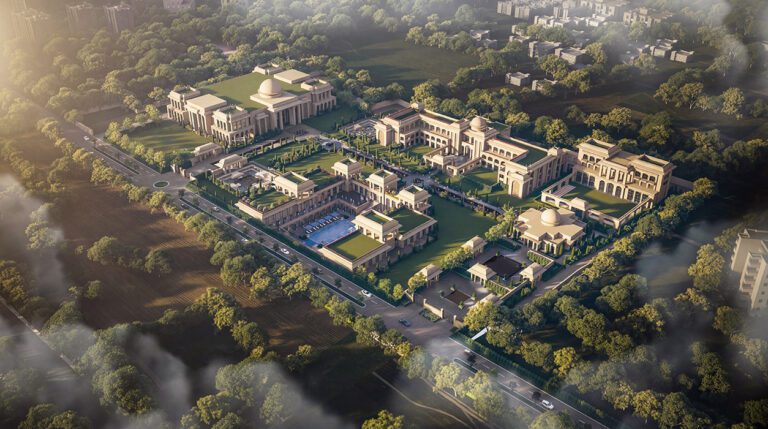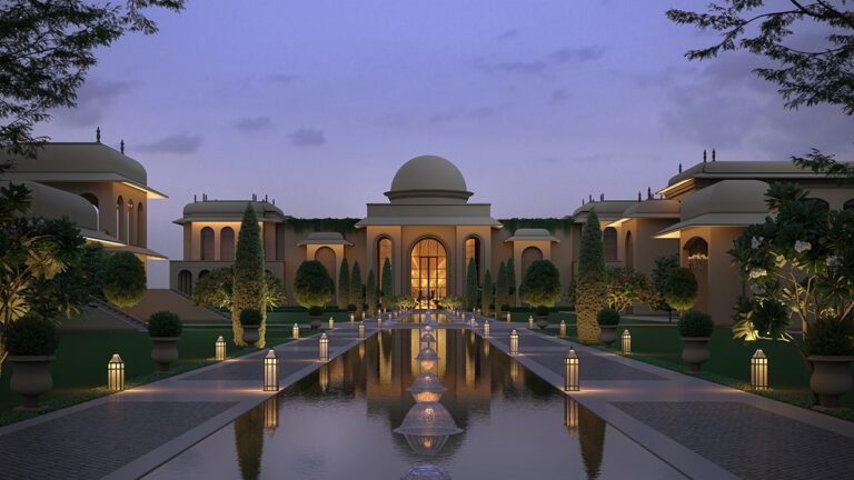 Located in Raipur, Swarnbhoomi is a 200-key wellness resort and hospitality precinct that reinterprets traditional Indian palace typologies through the lens of contemporary architectural precision. The project explores the intersection of monumental scale and refined detailing, creating a cohesive design language that bridges heritage-inspired geometry with the functional requirements of modern luxury hospitality. By stripping away superficial ornamentation, the architecture focuses on the purity of form—specifically through the use of domes, colonnades, and courtyards—to establish a timeless aesthetic rooted in the regional context.