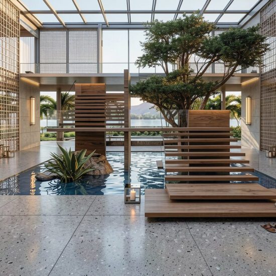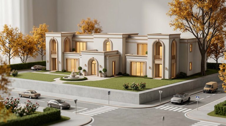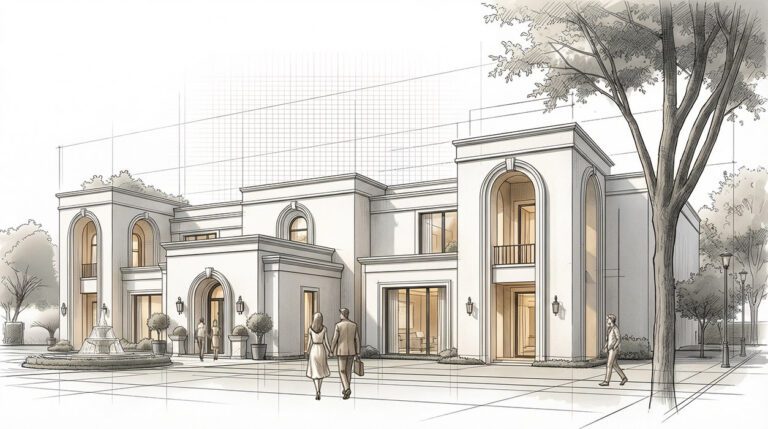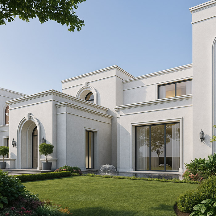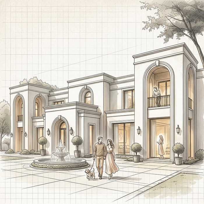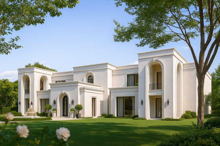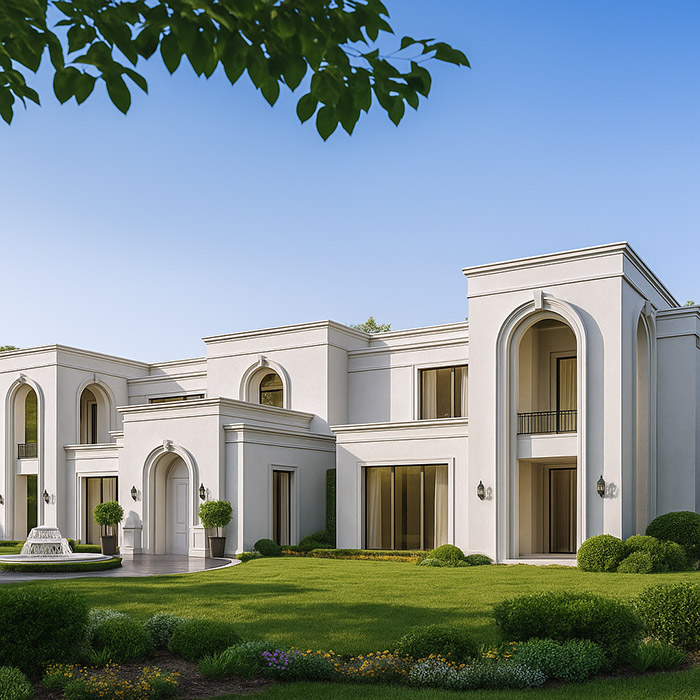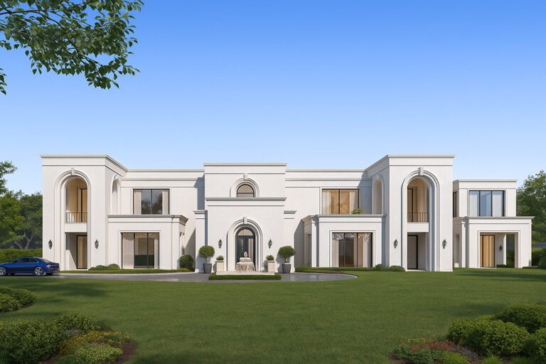 The Palladian House stands as a quiet dialogue between stone and sky. Its symmetrical form and white masonry provide a canvas for the day’s transit, as light and shadow dance across its arches to create a shifting sensory experience. The interior unfolds as a series of curated volumes—grand for gathering, yet secluded for retreat—each space linked by a profound, underlying harmony that anchors the home in a state of perpetual grace.