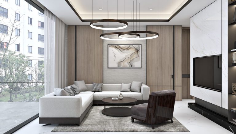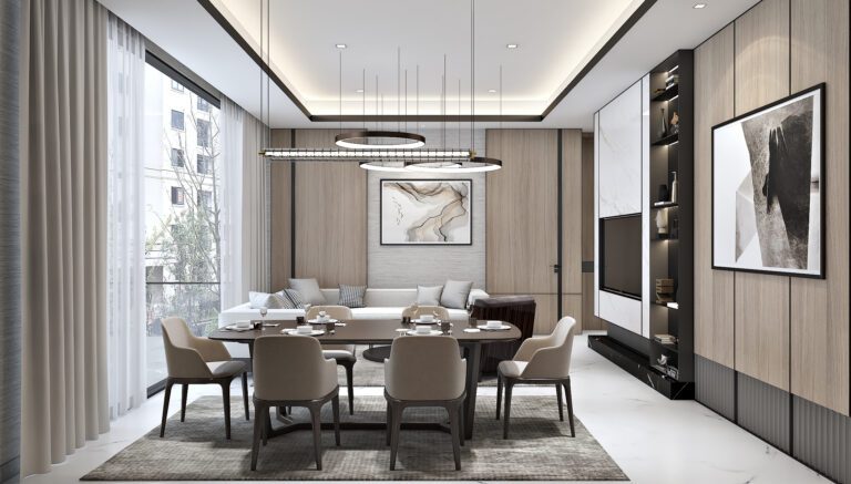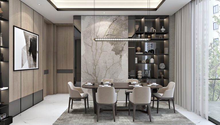 Natural wood finishes—warm oak and rich walnut—are at the heart of the interior, infusing the home with a sense of grounded sophistication. In balance with these earthy tones, the use of high-quality marble in select areas adds an understated touch of luxury, while sleek glass accents bring lightness and openness. The carefully curated neutral palette, in contrast with soft greys and occasional muted greens, invites a sense of calm throughout the residence.