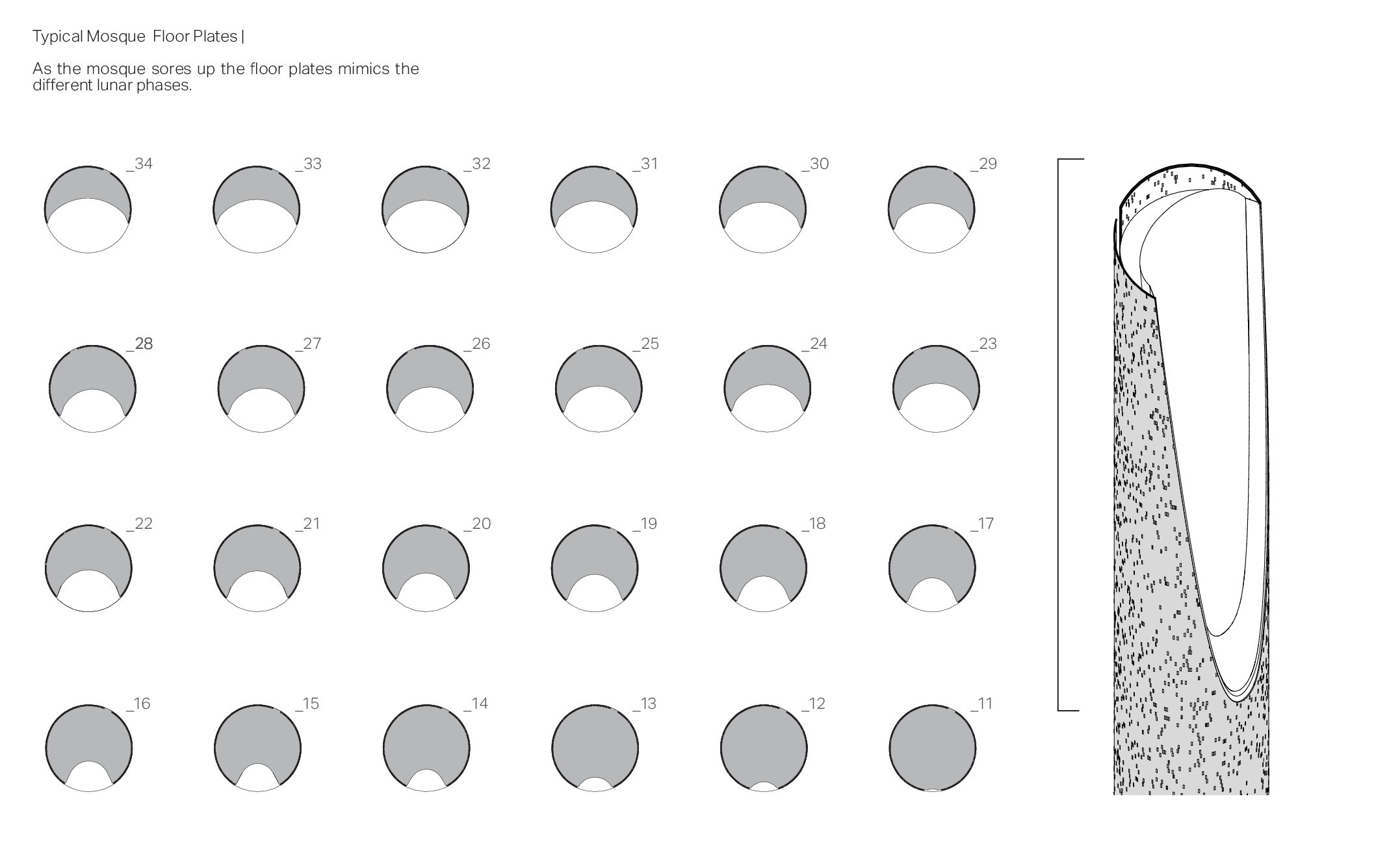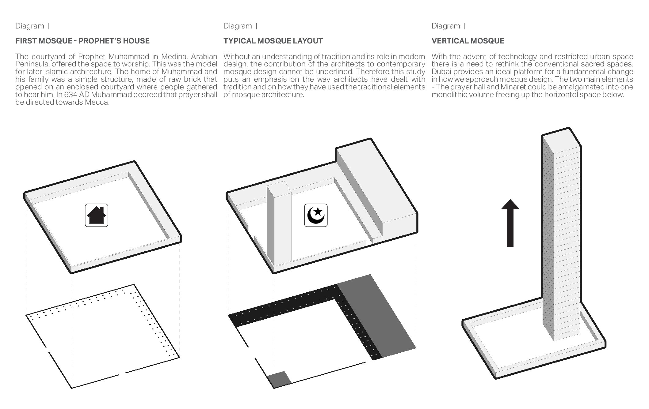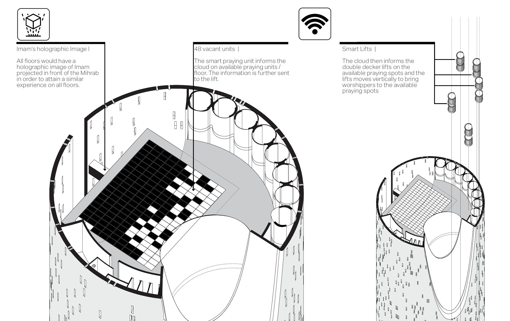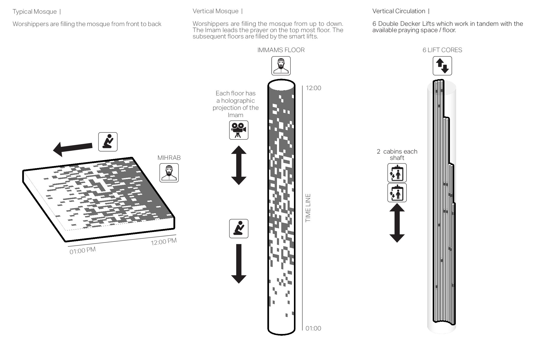 A successful religious building or site is one that enables these “religious” experiences to happen. In turn, the spiritual transformations that occur there can convert what was once an ordinary space into a sacred one. The Vertical monolith explores new typologies and introduces a fundamental shift in approaching mosque design. It cautiously examines the essential components which constitutes a Mosque and introduces a vertical concept of connecting with the divine.