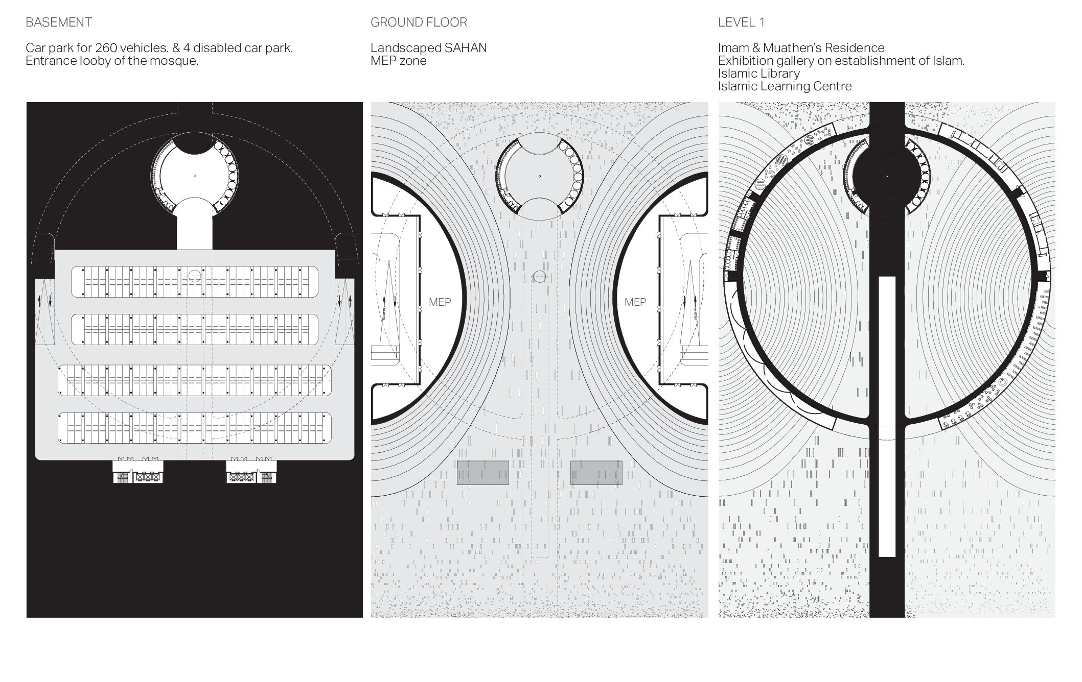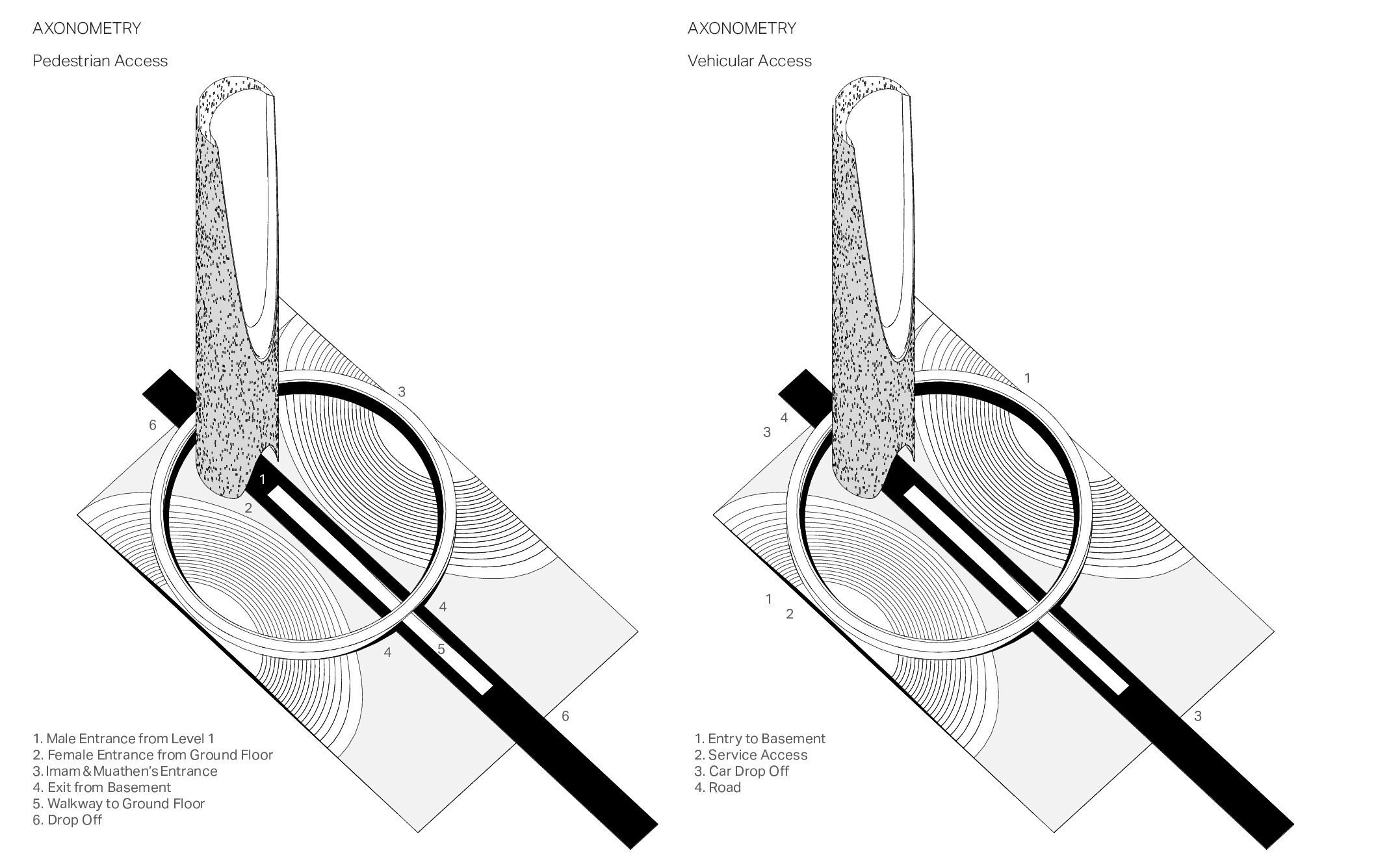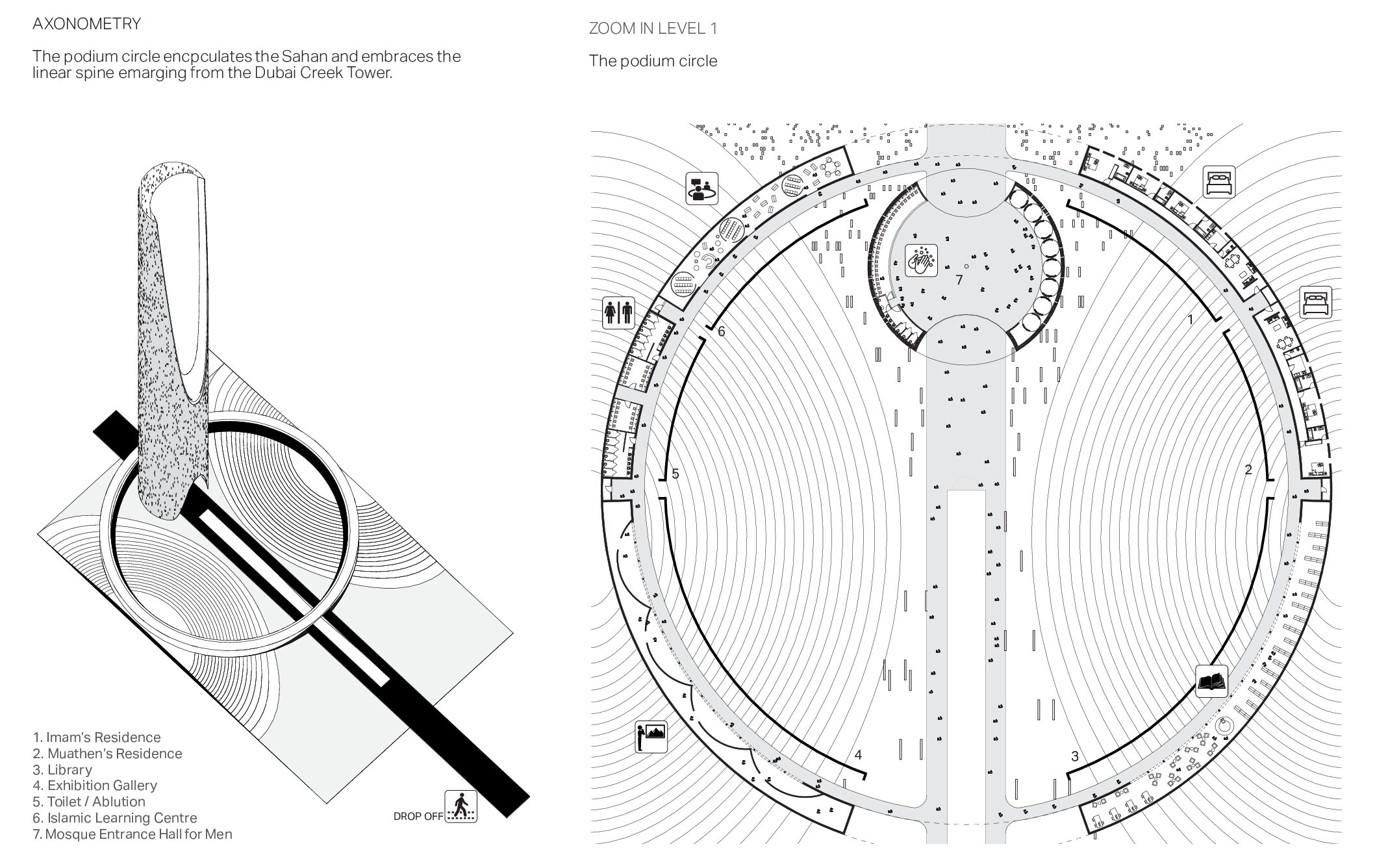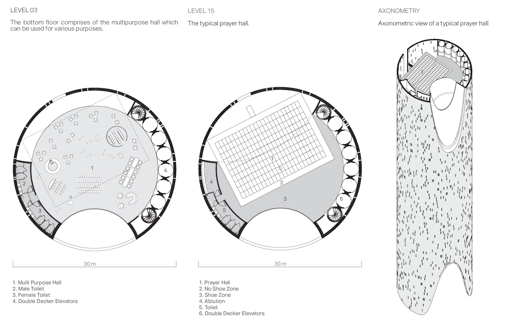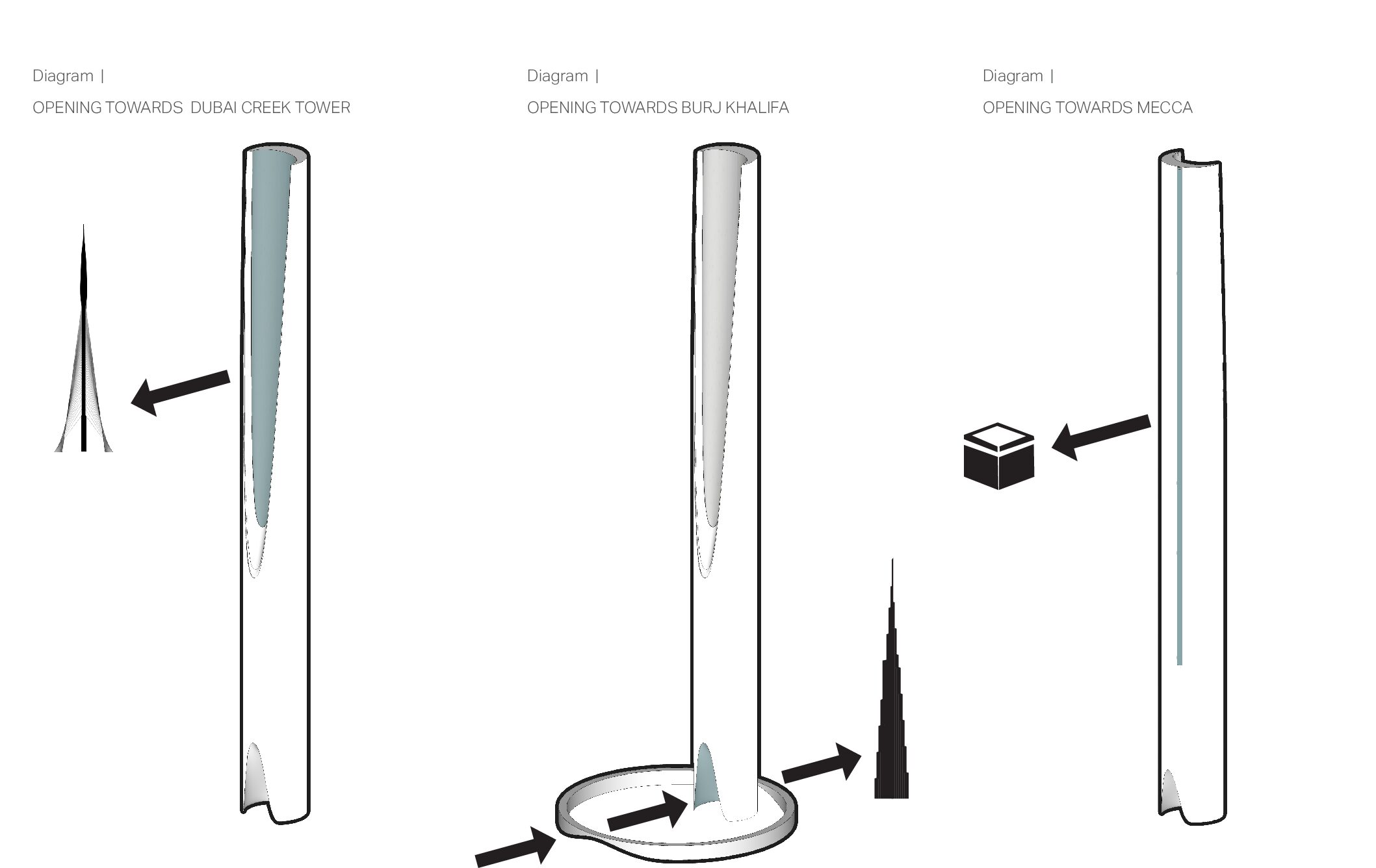 A successful religious building or site is one that enables these “religious” experiences to happen. In turn, the spiritual transformations that occur there can convert what was once an ordinary space into a sacred one. The Vertical monolith explores new typologies and introduces a fundamental shift in approaching mosque design. It cautiously examines the essential components which constitutes a Mosque and introduces a vertical concept of connecting with the divine.